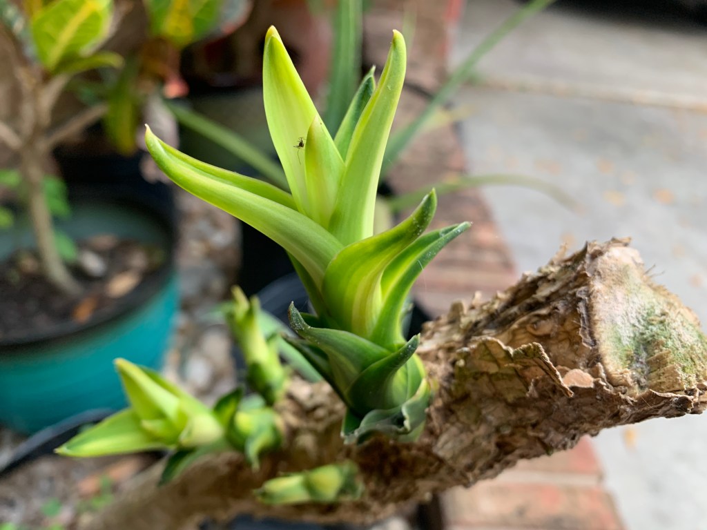 A green bud grows from the side of the trunk of a plant I had chopped off last summer. Nestled between its newly formed green leaves, lies a small drop of water, sparkling amongst the sun. Ants roam inside the bud and around the bark of the plant, seeking food and nourishment.